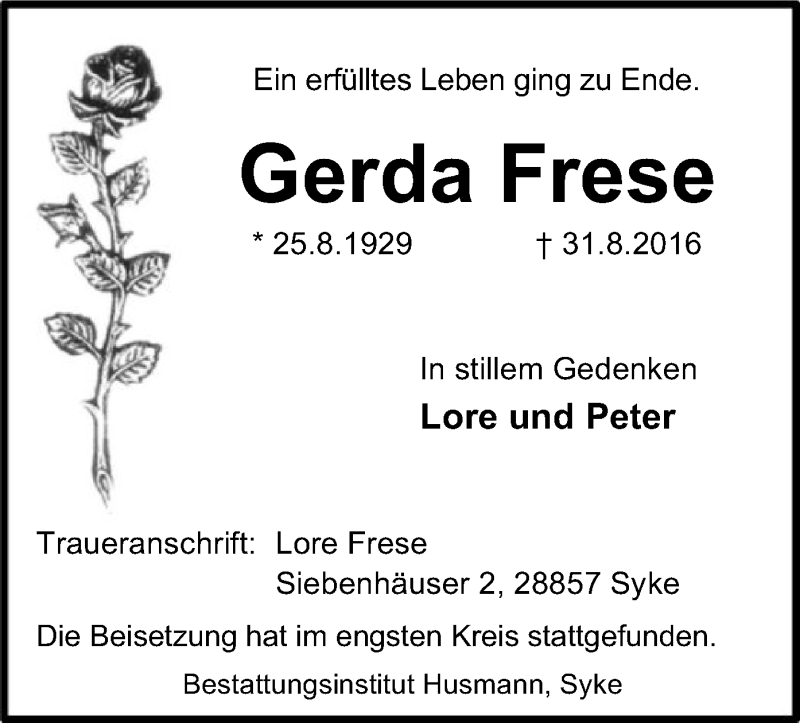 Hier finden Sie alle Traueranzeigen aus der Zeitung, die bisher für Gerda Frese erschienen sind. Weitere Traueranzeigen, die in der Zeitung erscheinen, werden hier ebenfalls aufgelistet