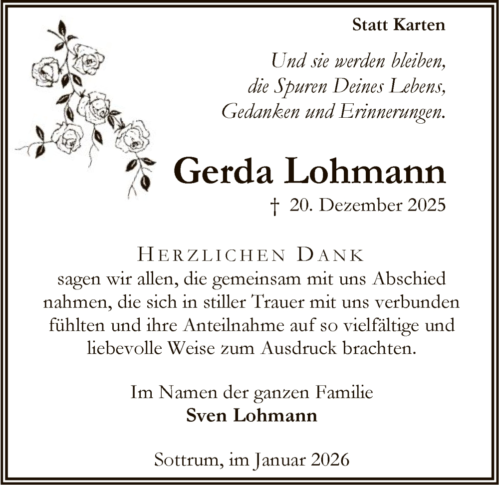 Hier finden Sie alle Traueranzeigen aus der Zeitung, die bisher für Gerda Lohmann erschienen sind. Weitere Traueranzeigen, die in der Zeitung erscheinen, werden hier ebenfalls aufgelistet