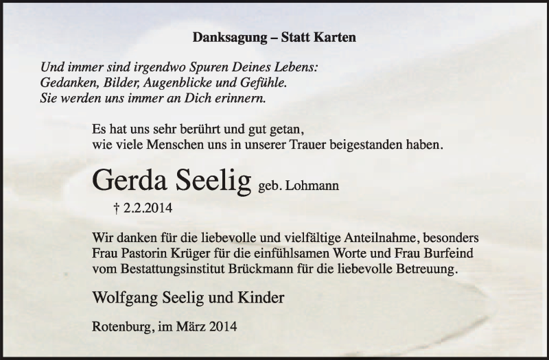 Hier finden Sie alle Traueranzeigen aus der Zeitung, die bisher für Gerda Seelig erschienen sind. Weitere Traueranzeigen, die in der Zeitung erscheinen, werden hier ebenfalls aufgelistet
