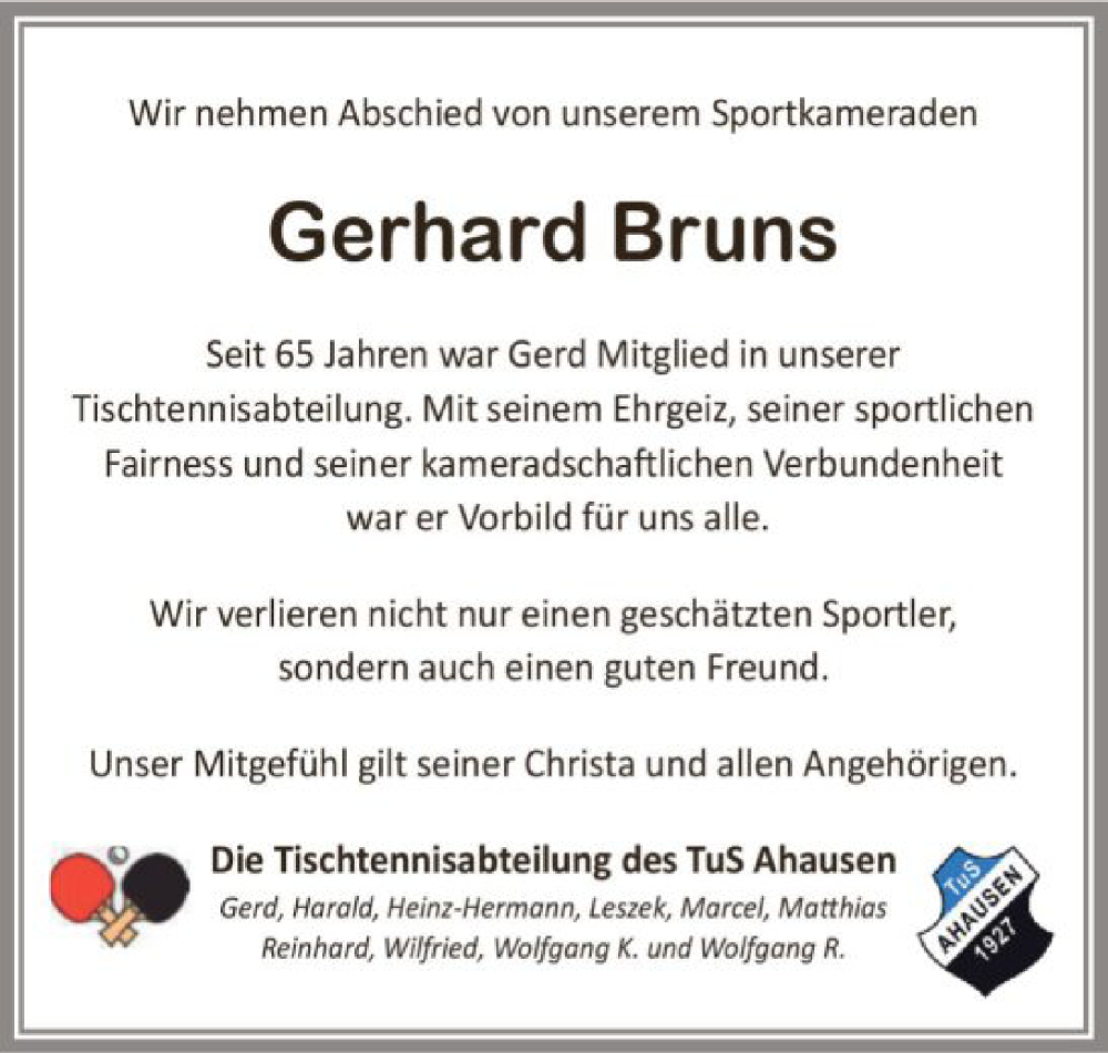 Hier finden Sie alle Traueranzeigen aus der Zeitung, die bisher für Gerhard Bruns erschienen sind. Weitere Traueranzeigen, die in der Zeitung erscheinen, werden hier ebenfalls aufgelistet