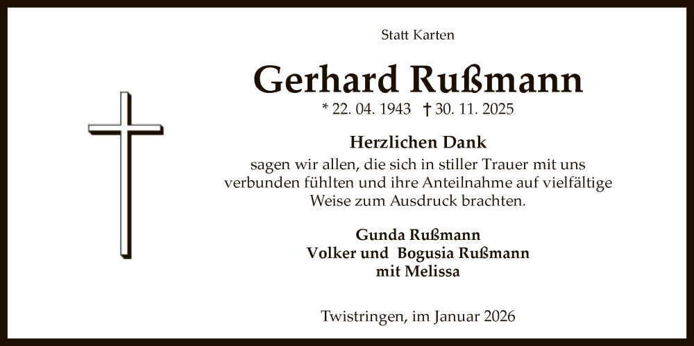 Hier finden Sie alle Traueranzeigen aus der Zeitung, die bisher für Gerhard Rußmann erschienen sind. Weitere Traueranzeigen, die in der Zeitung erscheinen, werden hier ebenfalls aufgelistet