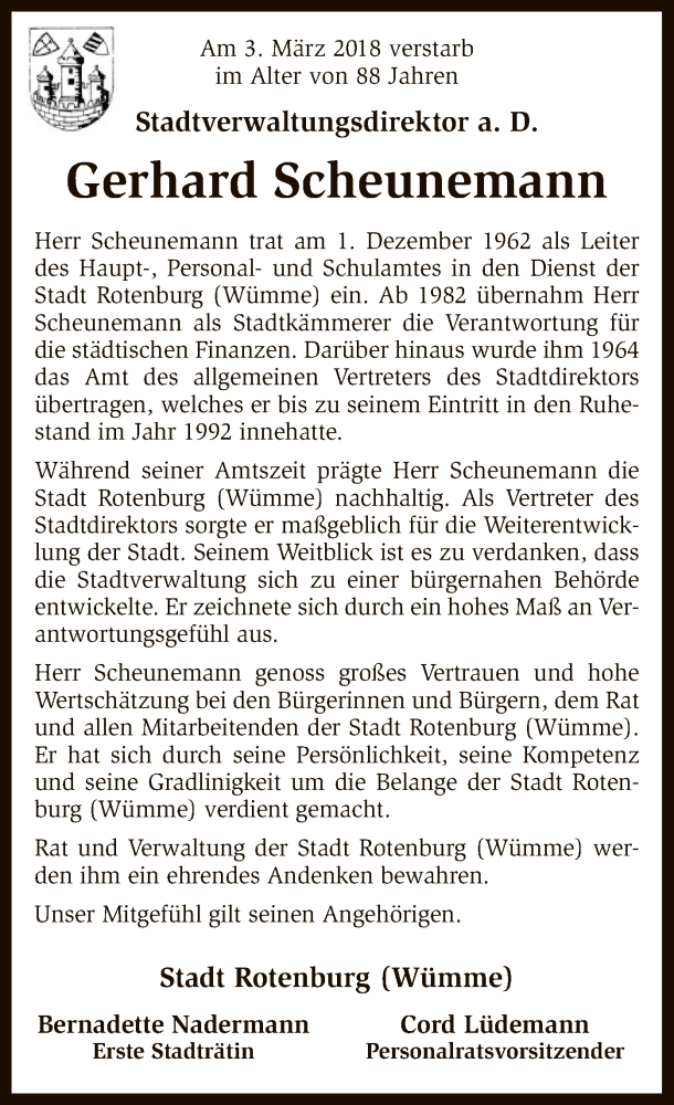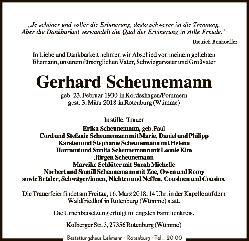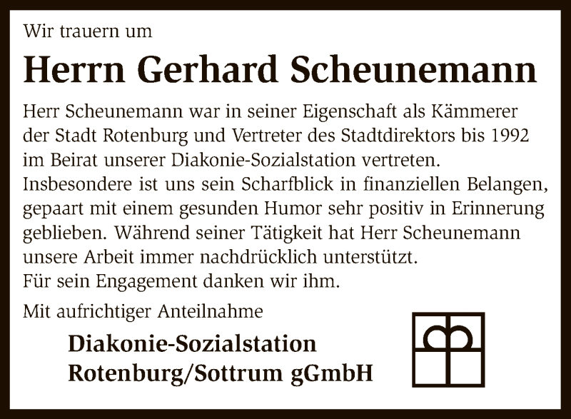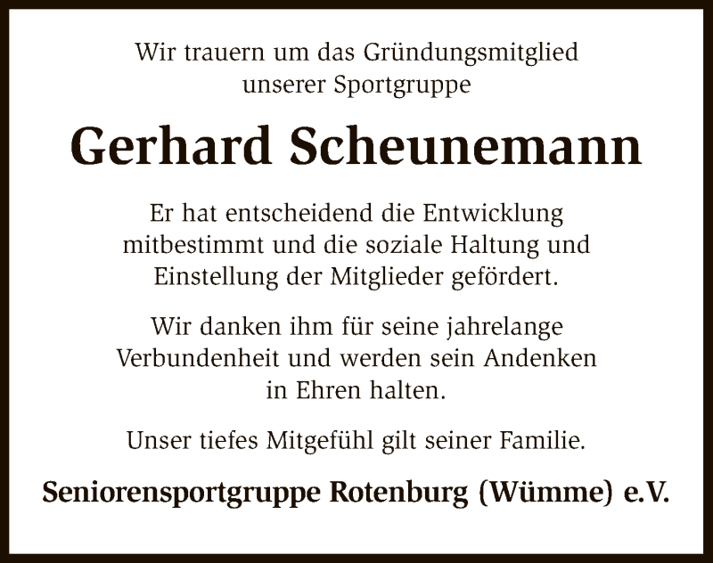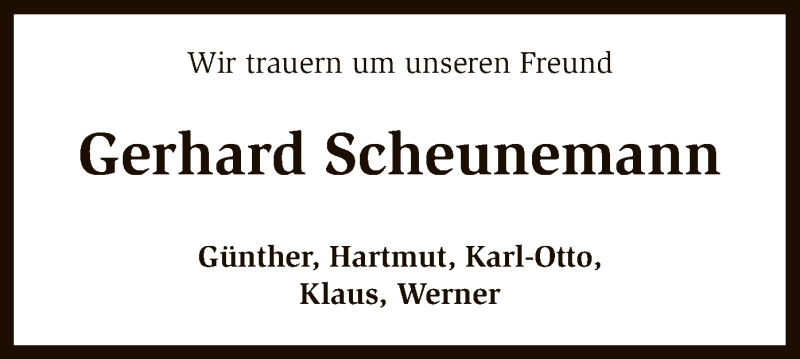 Hier finden Sie alle Traueranzeigen aus der Zeitung, die bisher für Gerhard Scheunemann erschienen sind. Weitere Traueranzeigen, die in der Zeitung erscheinen, werden hier ebenfalls aufgelistet