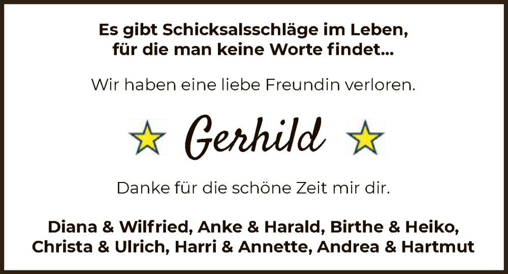 Hier finden Sie alle Traueranzeigen aus der Zeitung, die bisher für Gerhild erschienen sind. Weitere Traueranzeigen, die in der Zeitung erscheinen, werden hier ebenfalls aufgelistet