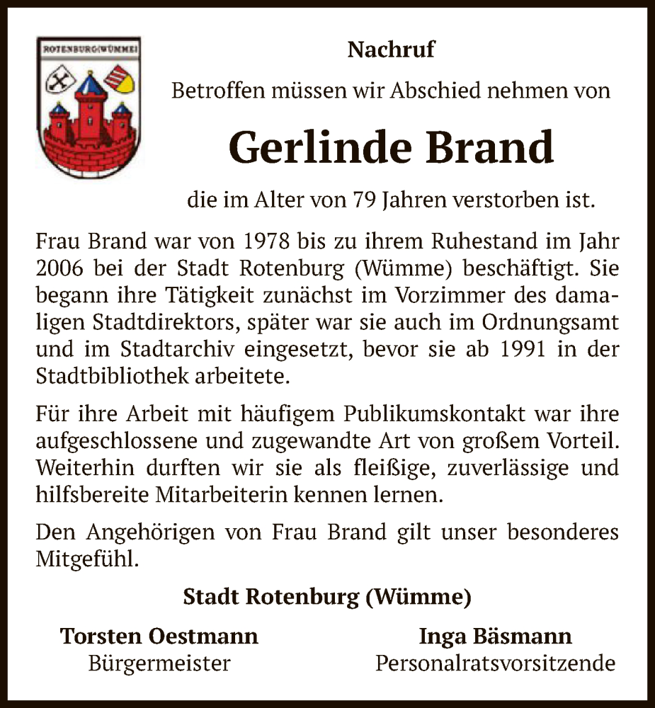 Hier finden Sie alle Traueranzeigen aus der Zeitung, die bisher für Gerlinde Brand erschienen sind. Weitere Traueranzeigen, die in der Zeitung erscheinen, werden hier ebenfalls aufgelistet