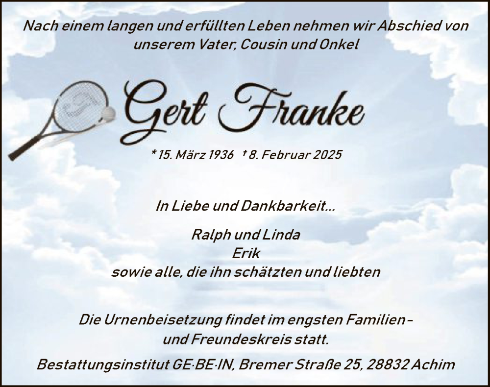 Hier finden Sie alle Traueranzeigen aus der Zeitung, die bisher für Gert Franke erschienen sind. Weitere Traueranzeigen, die in der Zeitung erscheinen, werden hier ebenfalls aufgelistet