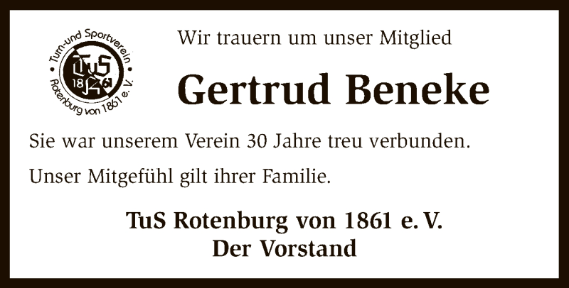 Hier finden Sie alle Traueranzeigen aus der Zeitung, die bisher für Gertrud Beneke erschienen sind. Weitere Traueranzeigen, die in der Zeitung erscheinen, werden hier ebenfalls aufgelistet