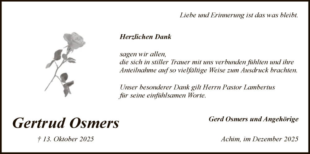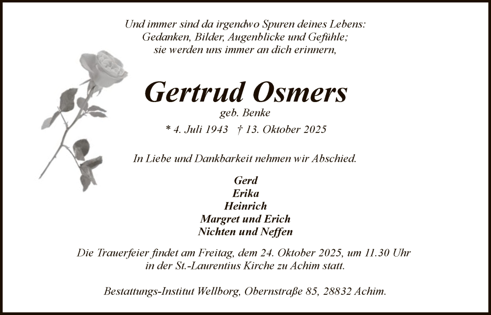 Hier finden Sie alle Traueranzeigen aus der Zeitung, die bisher für Gertrud Osmers erschienen sind. Weitere Traueranzeigen, die in der Zeitung erscheinen, werden hier ebenfalls aufgelistet