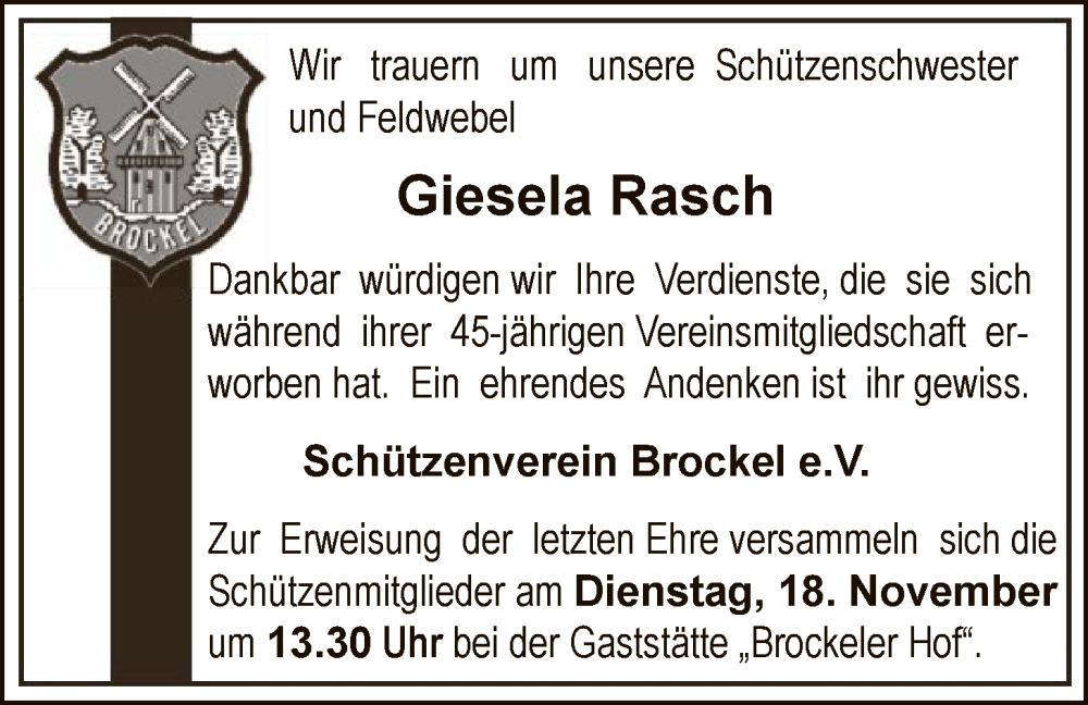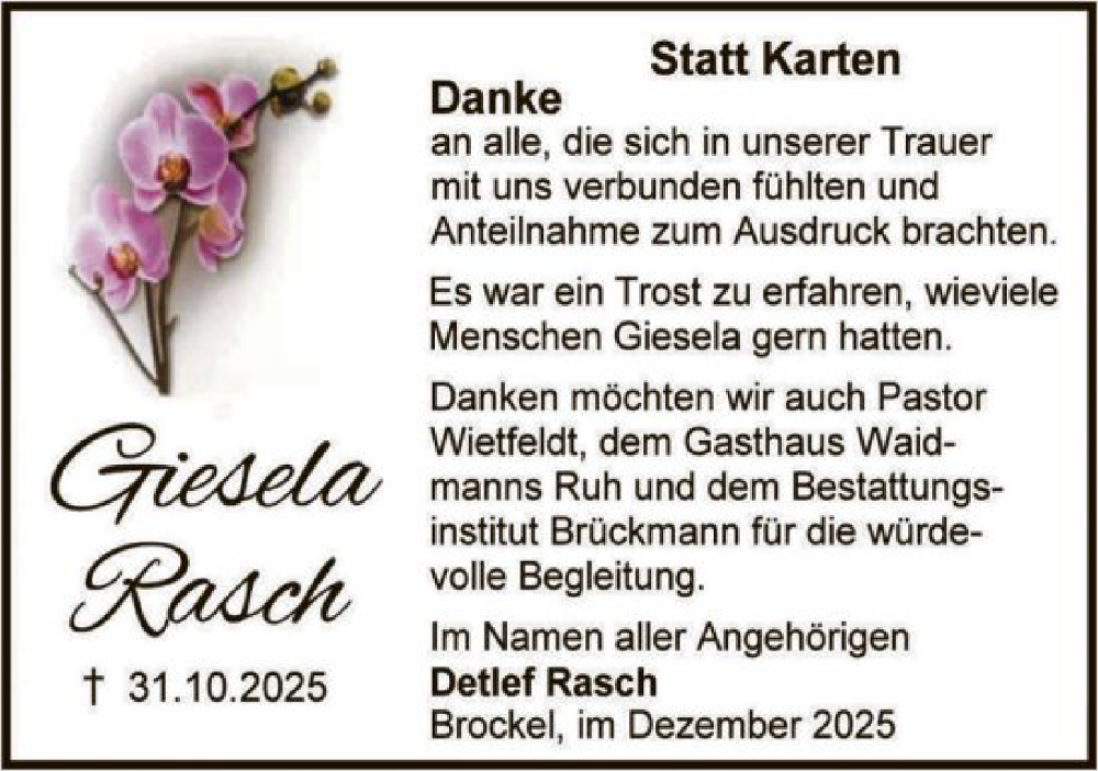 Hier finden Sie alle Traueranzeigen aus der Zeitung, die bisher für Giesela Rasch erschienen sind. Weitere Traueranzeigen, die in der Zeitung erscheinen, werden hier ebenfalls aufgelistet