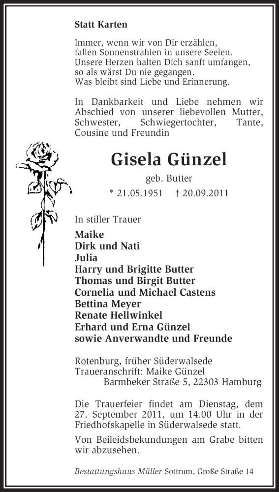 Hier finden Sie alle Traueranzeigen aus der Zeitung, die bisher für Gisela Günzel erschienen sind. Weitere Traueranzeigen, die in der Zeitung erscheinen, werden hier ebenfalls aufgelistet