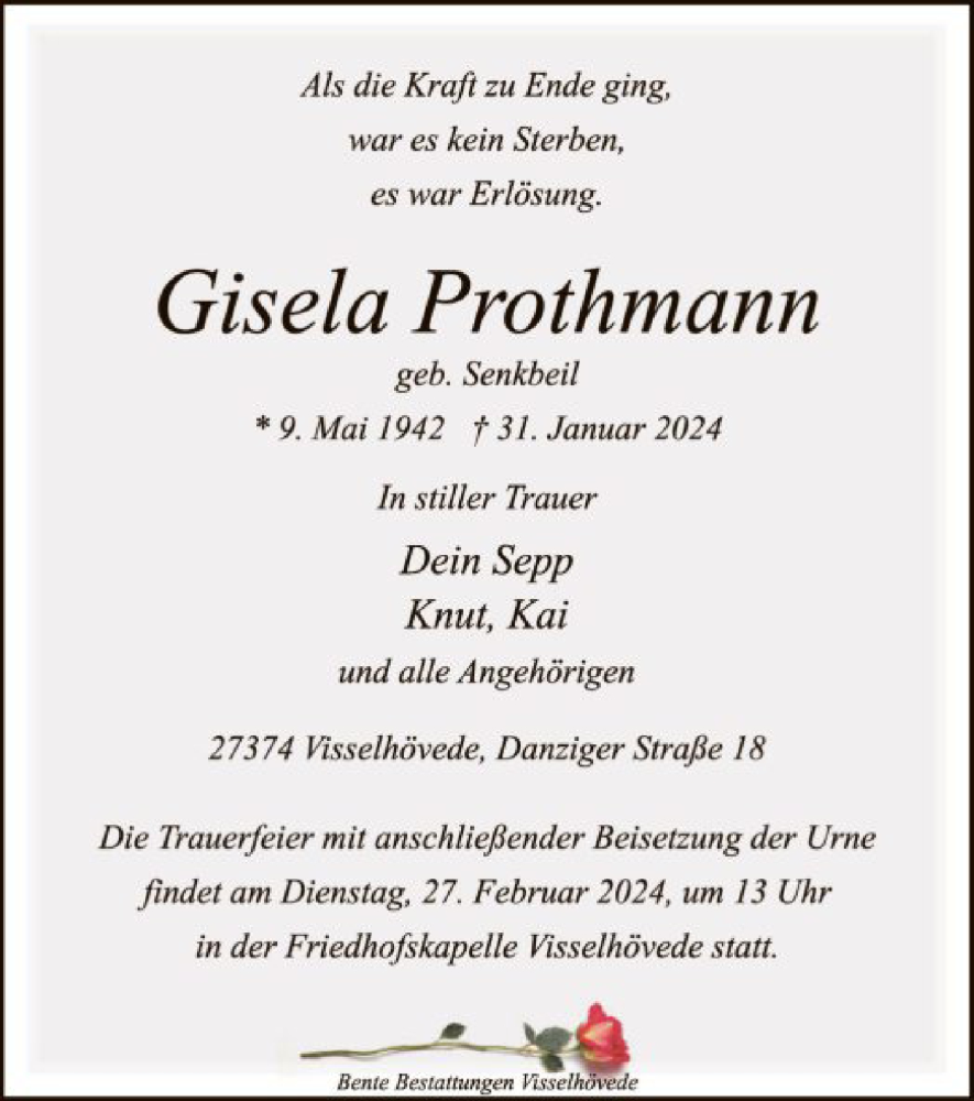 Hier finden Sie alle Traueranzeigen aus der Zeitung, die bisher für Gisela Prothmann erschienen sind. Weitere Traueranzeigen, die in der Zeitung erscheinen, werden hier ebenfalls aufgelistet
