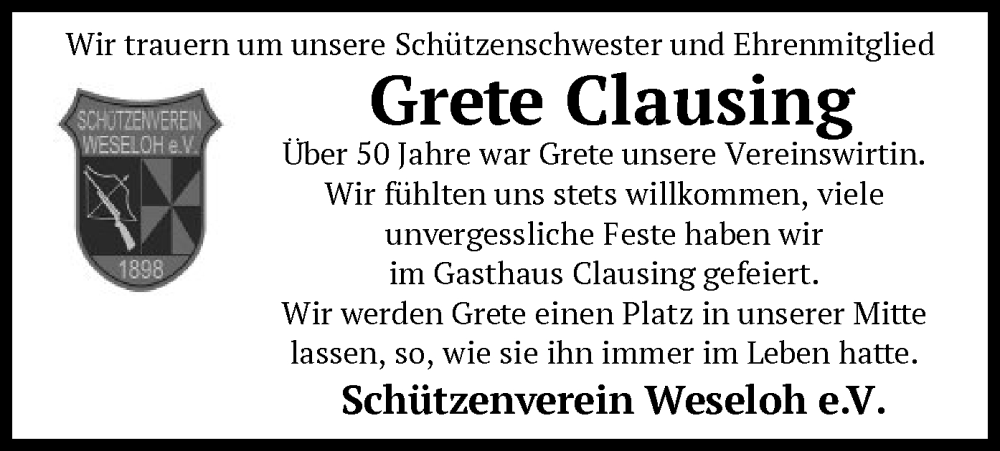 Hier finden Sie alle Traueranzeigen aus der Zeitung, die bisher für Grete Clausing erschienen sind. Weitere Traueranzeigen, die in der Zeitung erscheinen, werden hier ebenfalls aufgelistet