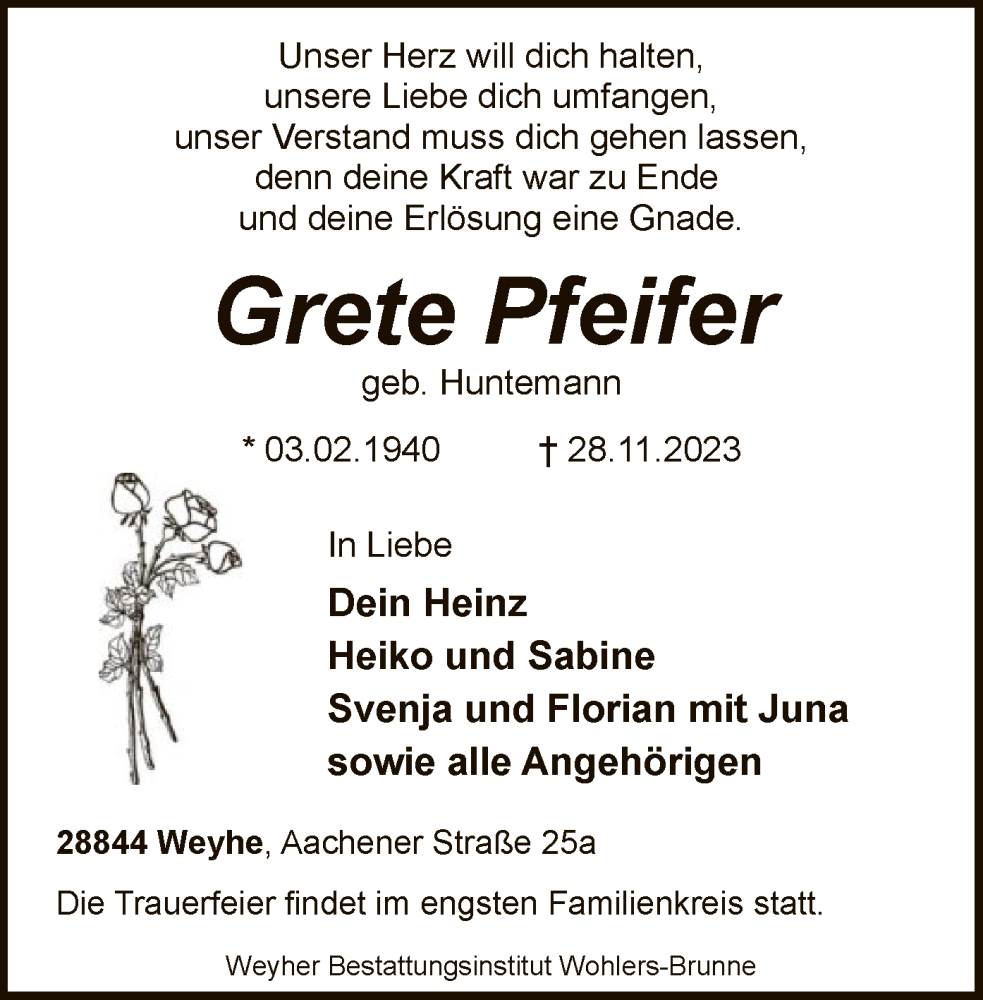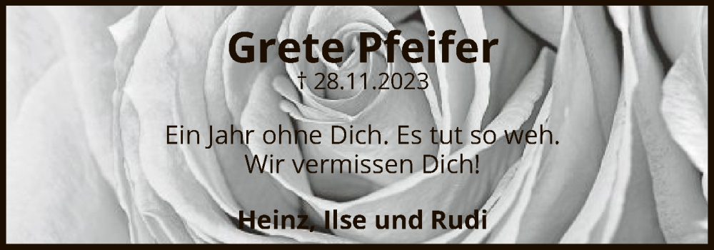 Hier finden Sie alle Traueranzeigen aus der Zeitung, die bisher für Grete Pfeifer erschienen sind. Weitere Traueranzeigen, die in der Zeitung erscheinen, werden hier ebenfalls aufgelistet