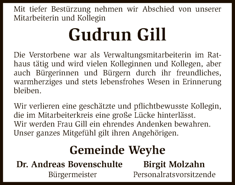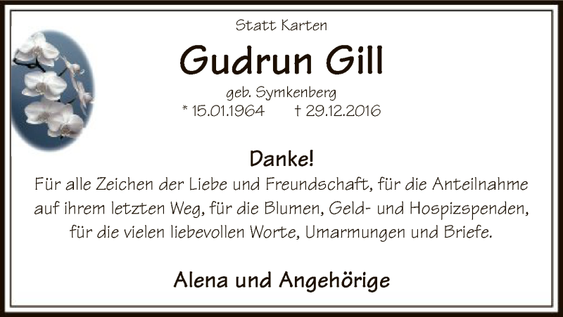 Hier finden Sie alle Traueranzeigen aus der Zeitung, die bisher für Gudrun Gill erschienen sind. Weitere Traueranzeigen, die in der Zeitung erscheinen, werden hier ebenfalls aufgelistet