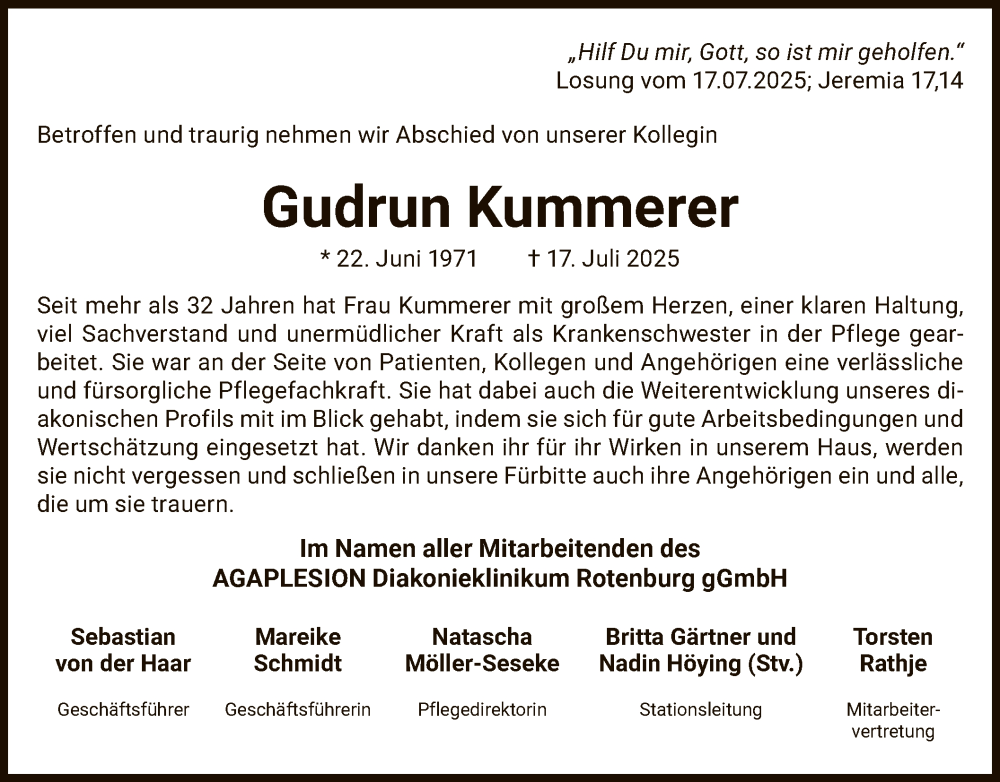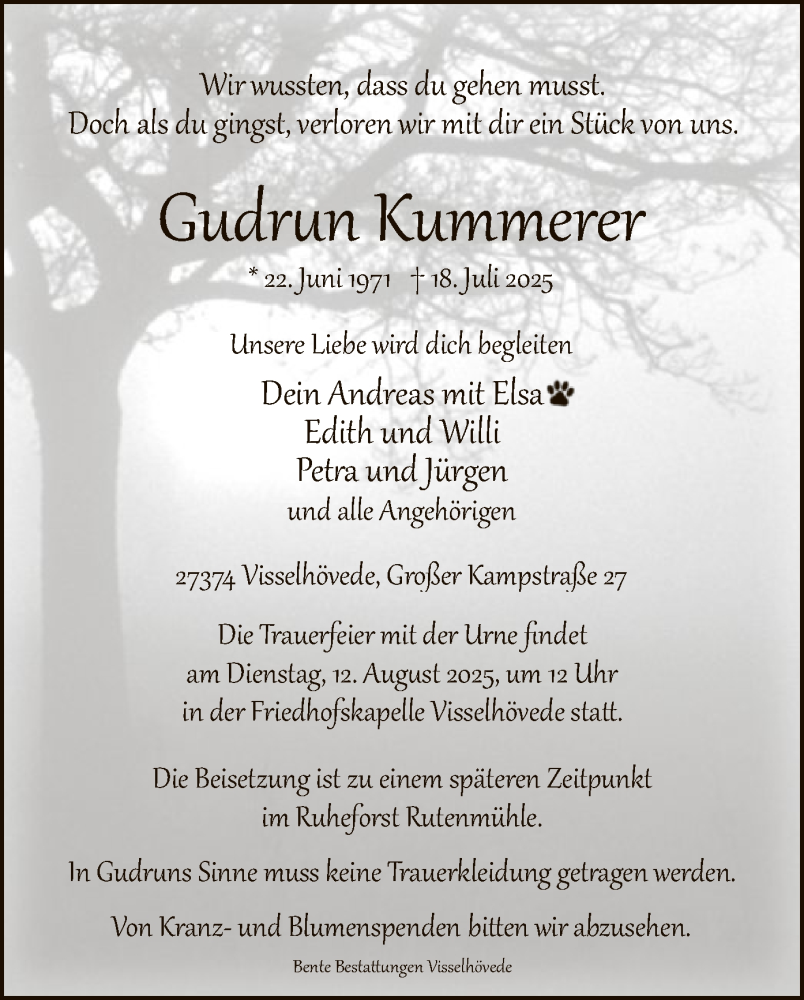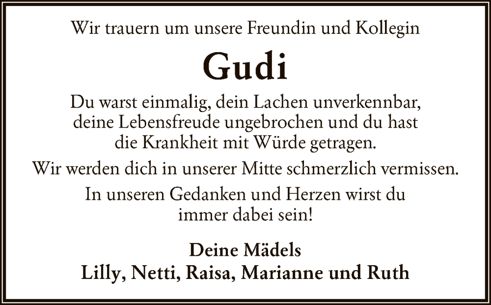 Hier finden Sie alle Traueranzeigen aus der Zeitung, die bisher für Gudrun Kummerer erschienen sind. Weitere Traueranzeigen, die in der Zeitung erscheinen, werden hier ebenfalls aufgelistet