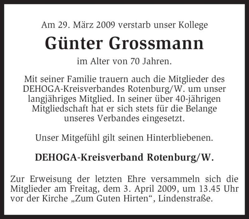 Hier finden Sie alle Traueranzeigen aus der Zeitung, die bisher für Günter Grossmann erschienen sind. Weitere Traueranzeigen, die in der Zeitung erscheinen, werden hier ebenfalls aufgelistet
