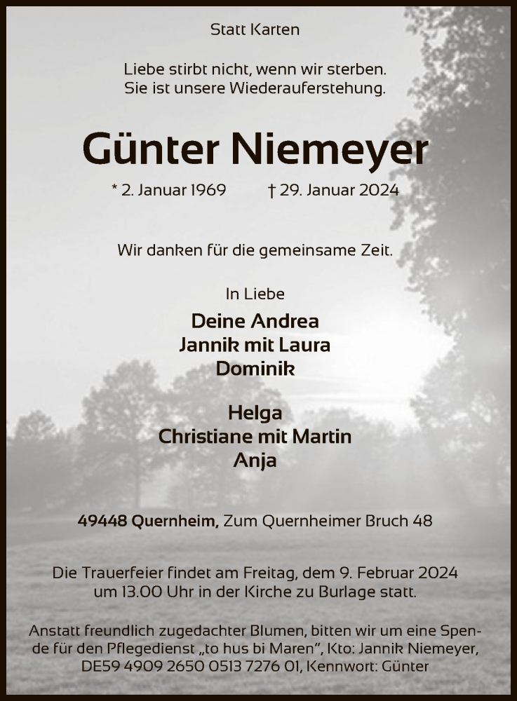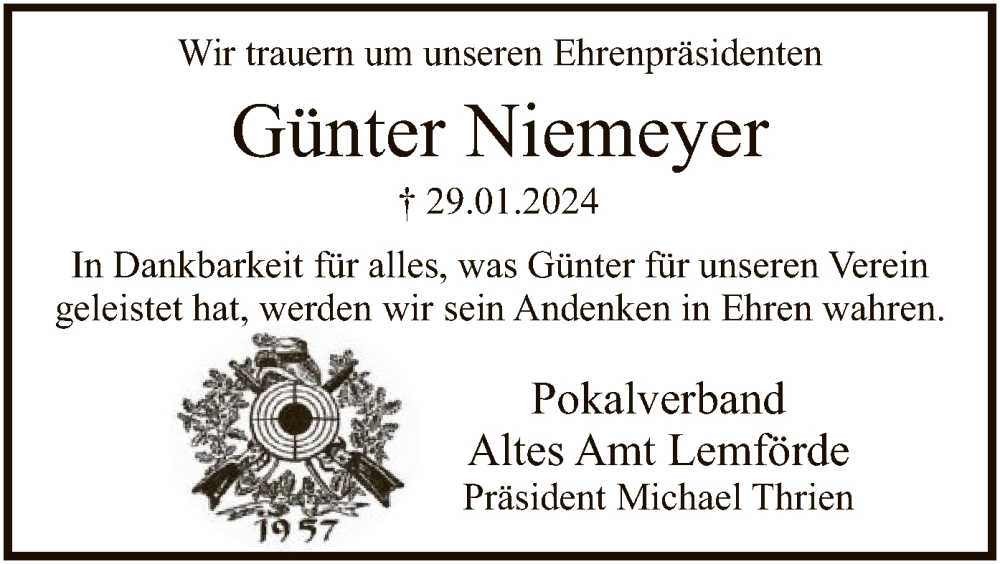 Hier finden Sie alle Traueranzeigen aus der Zeitung, die bisher für Günter Niemeyer erschienen sind. Weitere Traueranzeigen, die in der Zeitung erscheinen, werden hier ebenfalls aufgelistet