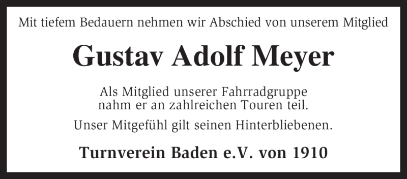 Hier finden Sie alle Traueranzeigen aus der Zeitung, die bisher für Gustav Adolf Meyer erschienen sind. Weitere Traueranzeigen, die in der Zeitung erscheinen, werden hier ebenfalls aufgelistet
