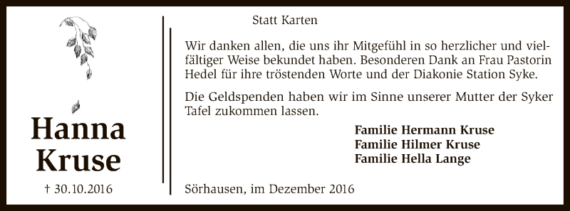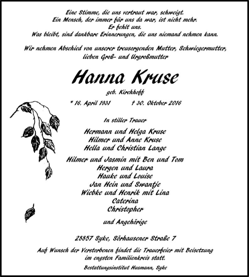 Hier finden Sie alle Traueranzeigen aus der Zeitung, die bisher für Hanna Kruse erschienen sind. Weitere Traueranzeigen, die in der Zeitung erscheinen, werden hier ebenfalls aufgelistet