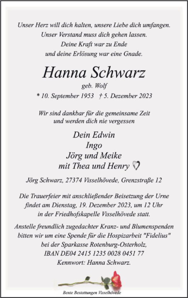 Hier finden Sie alle Traueranzeigen aus der Zeitung, die bisher für Hanna Schwarz erschienen sind. Weitere Traueranzeigen, die in der Zeitung erscheinen, werden hier ebenfalls aufgelistet
