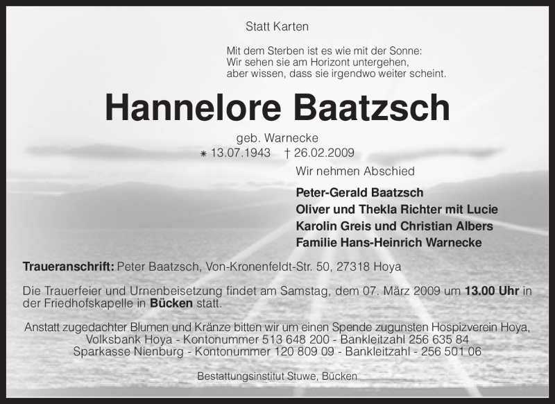 Hier finden Sie alle Traueranzeigen aus der Zeitung, die bisher für Hannelore Baatzsch erschienen sind. Weitere Traueranzeigen, die in der Zeitung erscheinen, werden hier ebenfalls aufgelistet
