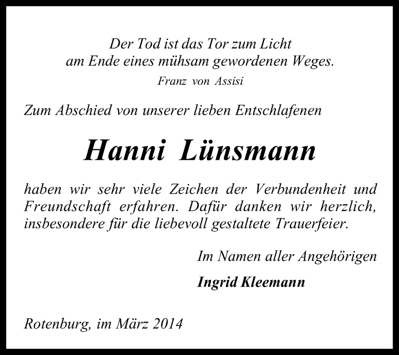Hier finden Sie alle Traueranzeigen aus der Zeitung, die bisher für Hanni Lünsmann erschienen sind. Weitere Traueranzeigen, die in der Zeitung erscheinen, werden hier ebenfalls aufgelistet