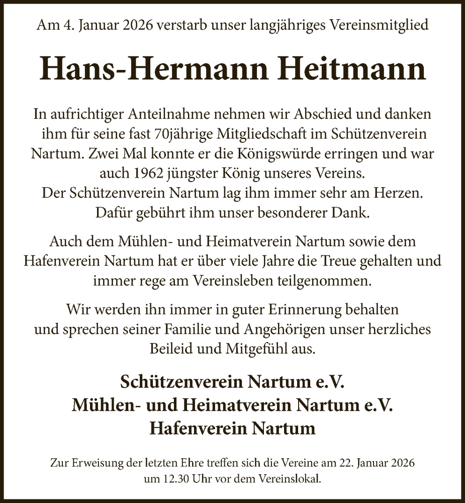 Hier finden Sie alle Traueranzeigen aus der Zeitung, die bisher für Hans-Hermann Heitmann erschienen sind. Weitere Traueranzeigen, die in der Zeitung erscheinen, werden hier ebenfalls aufgelistet