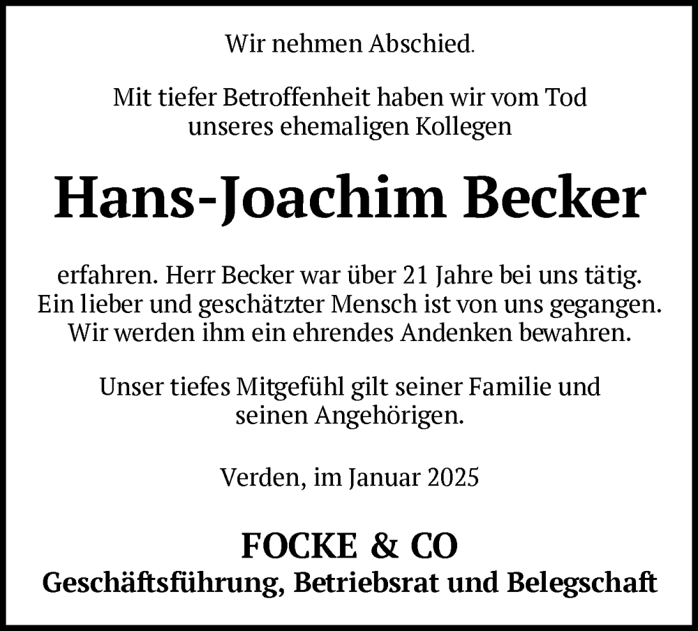 Hier finden Sie alle Traueranzeigen aus der Zeitung, die bisher für Hans-Joachim Becker erschienen sind. Weitere Traueranzeigen, die in der Zeitung erscheinen, werden hier ebenfalls aufgelistet