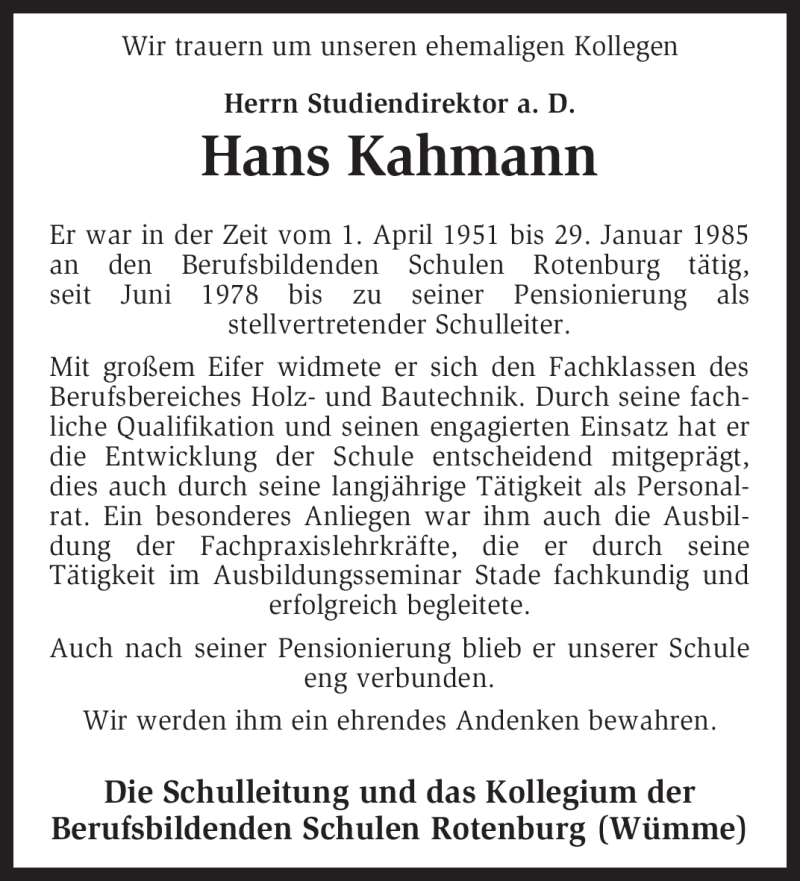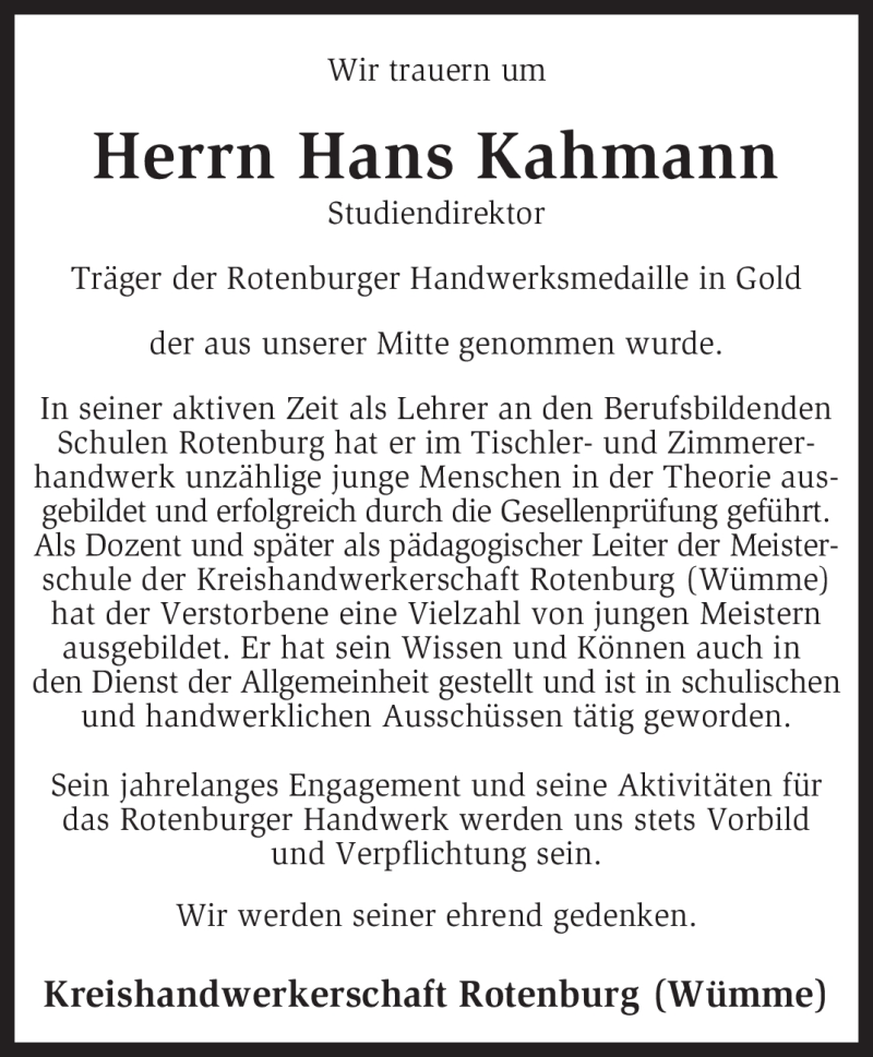 Hier finden Sie alle Traueranzeigen aus der Zeitung, die bisher für Hans Kahmann erschienen sind. Weitere Traueranzeigen, die in der Zeitung erscheinen, werden hier ebenfalls aufgelistet