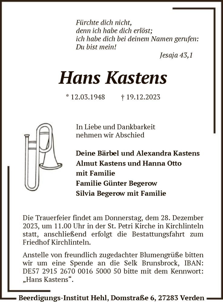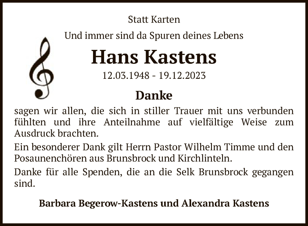 Hier finden Sie alle Traueranzeigen aus der Zeitung, die bisher für Hans Kastens erschienen sind. Weitere Traueranzeigen, die in der Zeitung erscheinen, werden hier ebenfalls aufgelistet