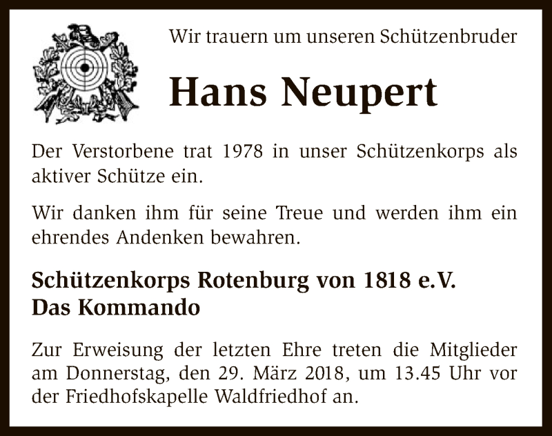 Hier finden Sie alle Traueranzeigen aus der Zeitung, die bisher für Hans Neupert erschienen sind. Weitere Traueranzeigen, die in der Zeitung erscheinen, werden hier ebenfalls aufgelistet