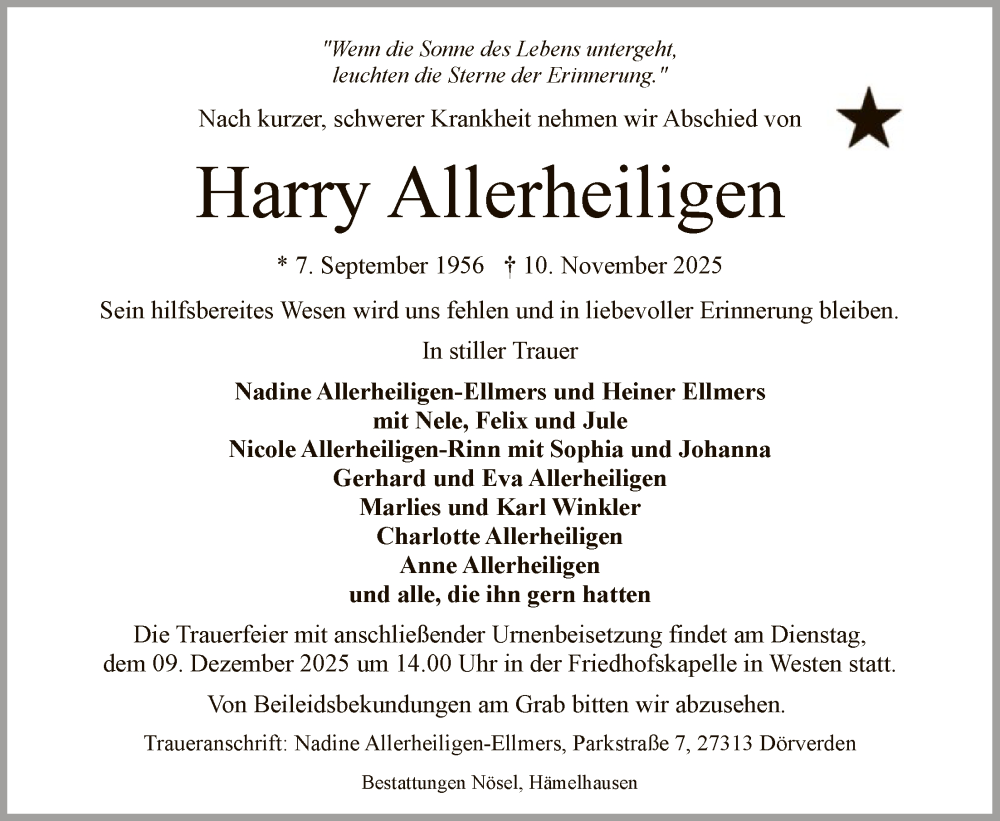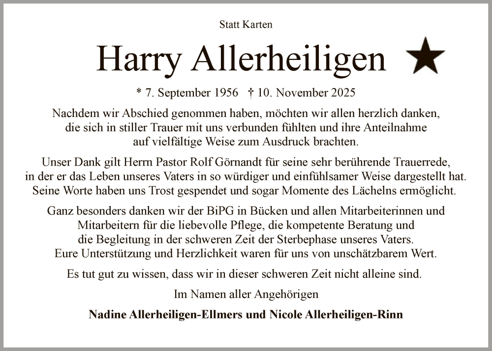 Hier finden Sie alle Traueranzeigen aus der Zeitung, die bisher für Harry Allerheiligen erschienen sind. Weitere Traueranzeigen, die in der Zeitung erscheinen, werden hier ebenfalls aufgelistet