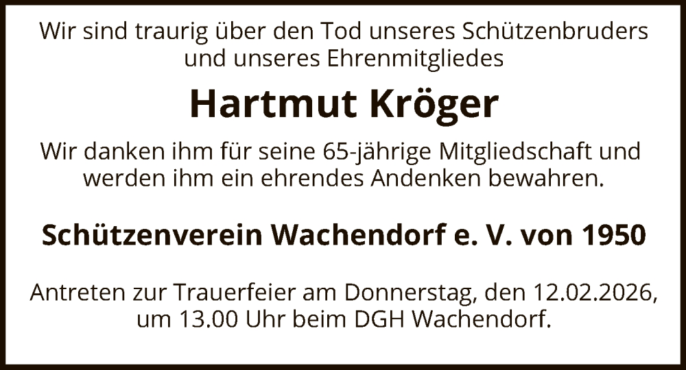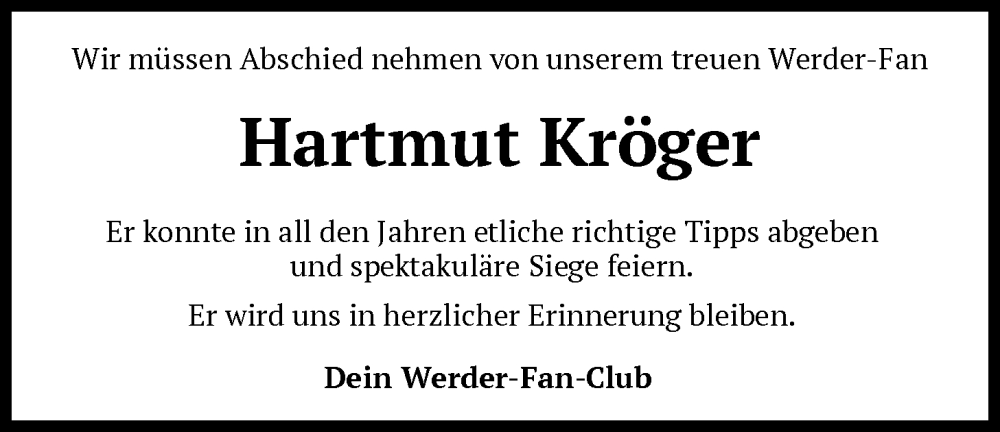 Hier finden Sie alle Traueranzeigen aus der Zeitung, die bisher für Hartmut Kröger erschienen sind. Weitere Traueranzeigen, die in der Zeitung erscheinen, werden hier ebenfalls aufgelistet