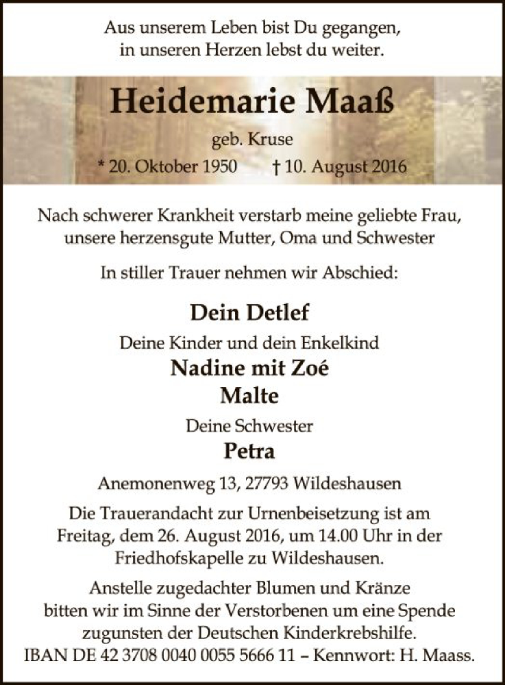 Hier finden Sie alle Traueranzeigen aus der Zeitung, die bisher für Heidemarie Maaß erschienen sind. Weitere Traueranzeigen, die in der Zeitung erscheinen, werden hier ebenfalls aufgelistet