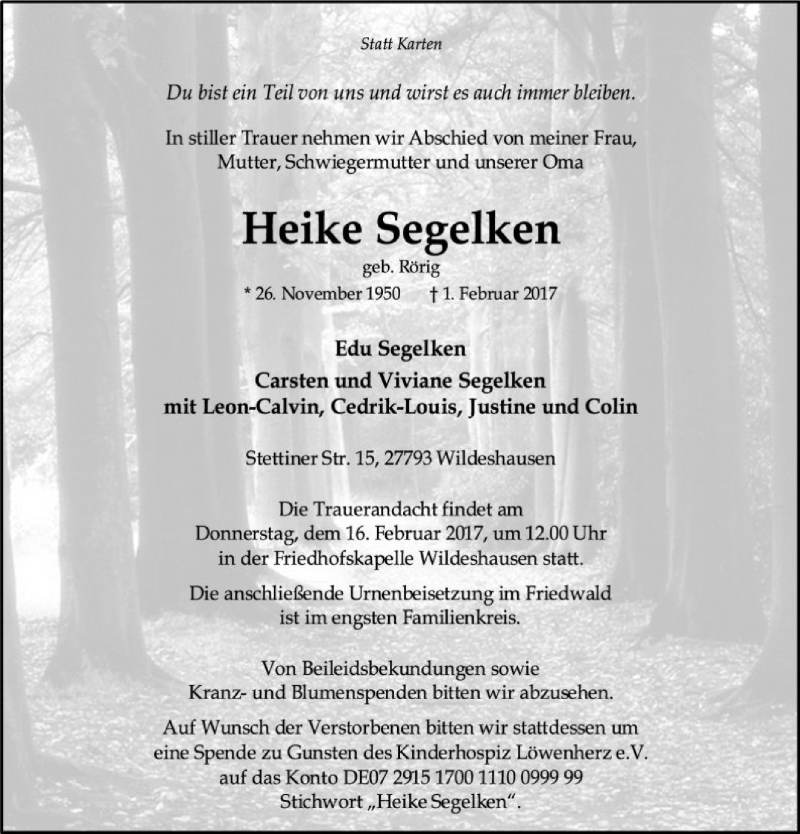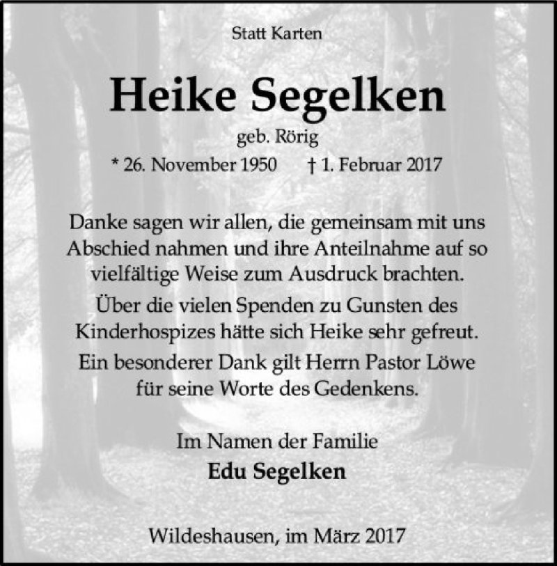 Hier finden Sie alle Traueranzeigen aus der Zeitung, die bisher für Heike Segelken erschienen sind. Weitere Traueranzeigen, die in der Zeitung erscheinen, werden hier ebenfalls aufgelistet