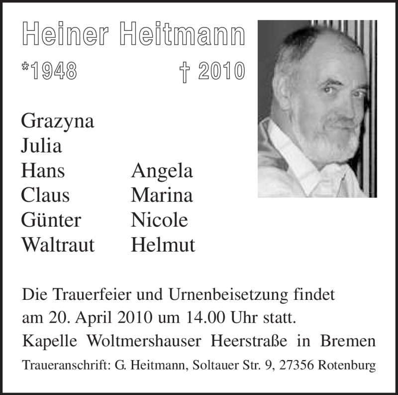 Hier finden Sie alle Traueranzeigen aus der Zeitung, die bisher für Heiner Heitmann erschienen sind. Weitere Traueranzeigen, die in der Zeitung erscheinen, werden hier ebenfalls aufgelistet