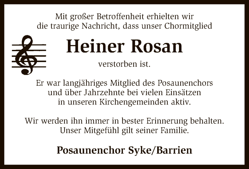 Hier finden Sie alle Traueranzeigen aus der Zeitung, die bisher für Heiner Rosan erschienen sind. Weitere Traueranzeigen, die in der Zeitung erscheinen, werden hier ebenfalls aufgelistet