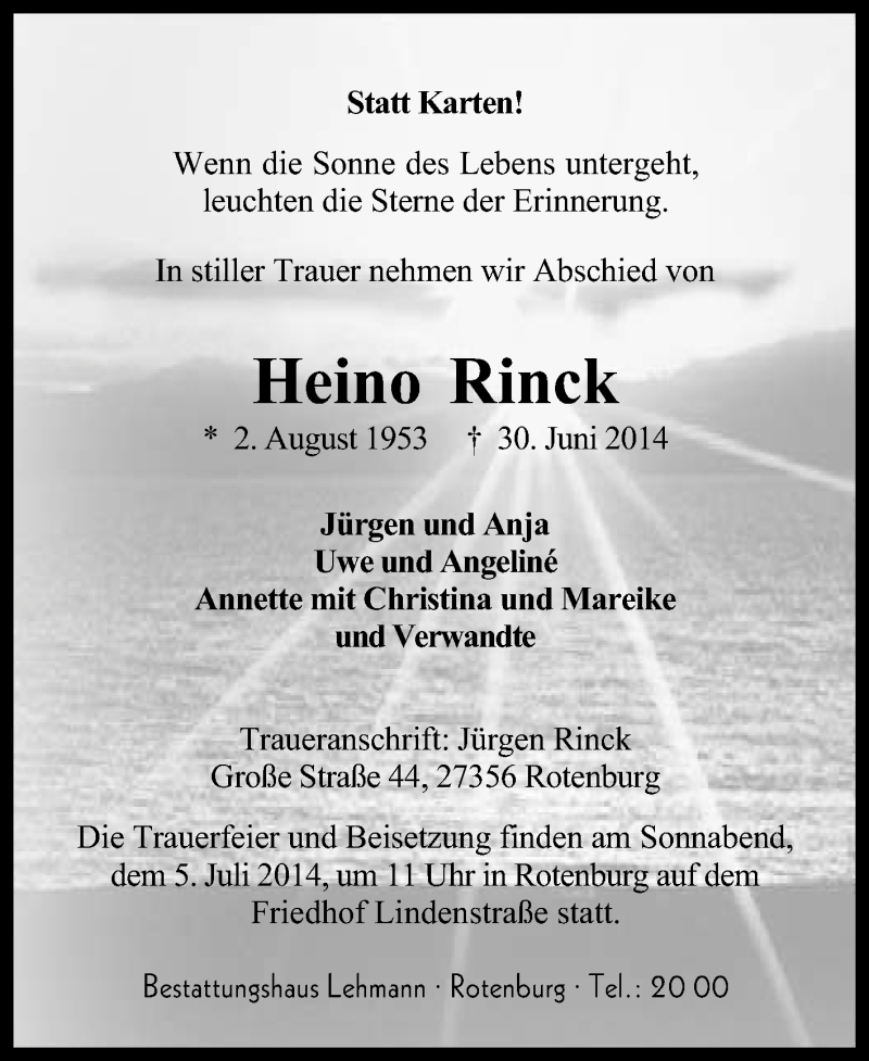 Hier finden Sie alle Traueranzeigen aus der Zeitung, die bisher für Heino Rinck erschienen sind. Weitere Traueranzeigen, die in der Zeitung erscheinen, werden hier ebenfalls aufgelistet