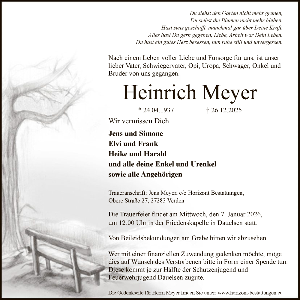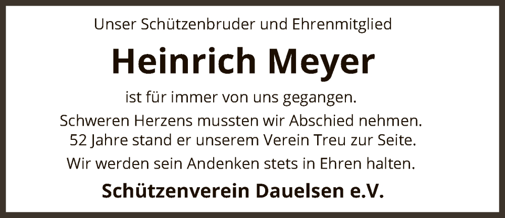 Hier finden Sie alle Traueranzeigen aus der Zeitung, die bisher für Heinrich Meyer erschienen sind. Weitere Traueranzeigen, die in der Zeitung erscheinen, werden hier ebenfalls aufgelistet