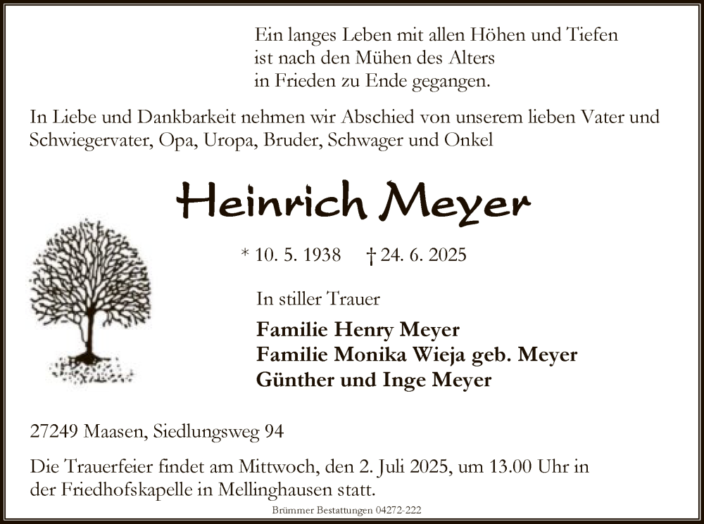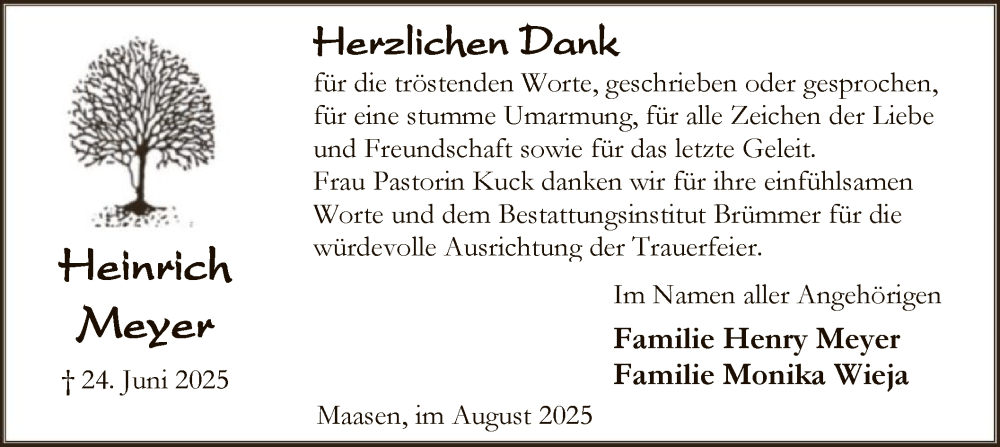 Hier finden Sie alle Traueranzeigen aus der Zeitung, die bisher für Heinrich Meyer erschienen sind. Weitere Traueranzeigen, die in der Zeitung erscheinen, werden hier ebenfalls aufgelistet