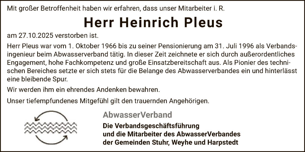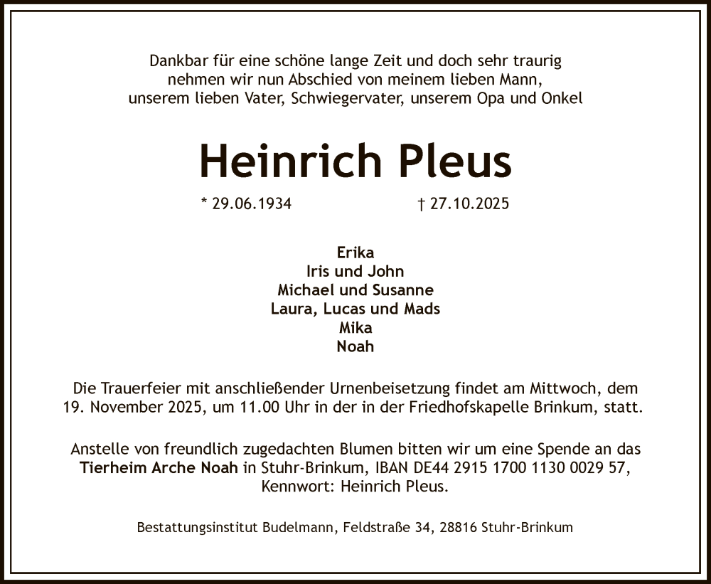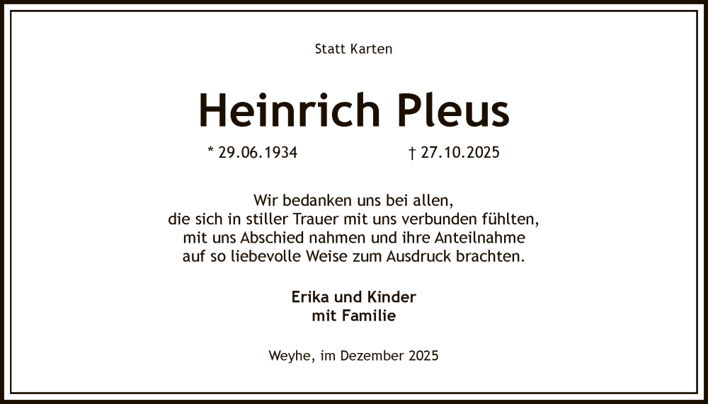 Hier finden Sie alle Traueranzeigen aus der Zeitung, die bisher für Heinrich Pleus erschienen sind. Weitere Traueranzeigen, die in der Zeitung erscheinen, werden hier ebenfalls aufgelistet