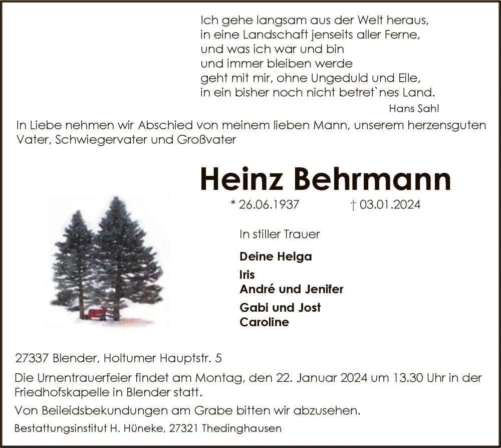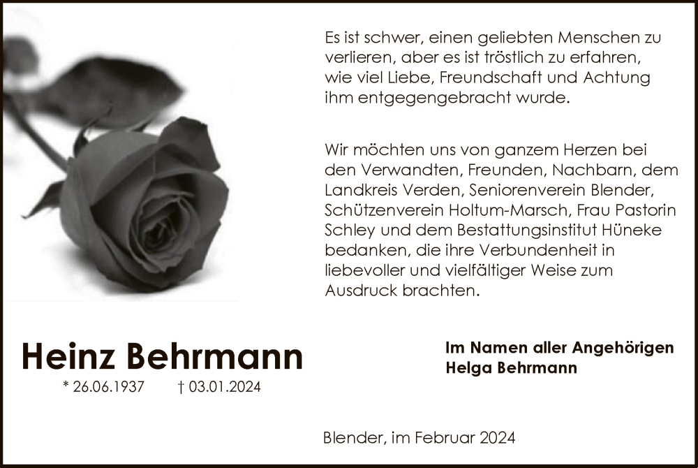 Hier finden Sie alle Traueranzeigen aus der Zeitung, die bisher für Heinz Behrmann erschienen sind. Weitere Traueranzeigen, die in der Zeitung erscheinen, werden hier ebenfalls aufgelistet