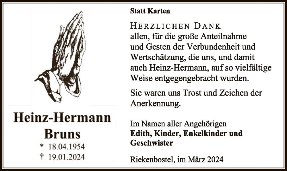 Hier finden Sie alle Traueranzeigen aus der Zeitung, die bisher für Heinz-Hermann Bruns erschienen sind. Weitere Traueranzeigen, die in der Zeitung erscheinen, werden hier ebenfalls aufgelistet