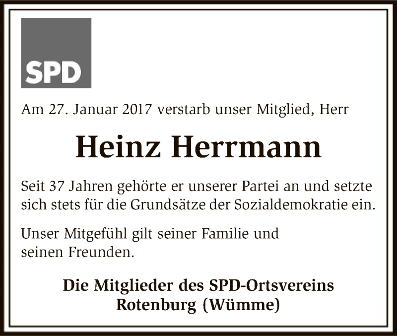 Hier finden Sie alle Traueranzeigen aus der Zeitung, die bisher für Heinz Herrmann erschienen sind. Weitere Traueranzeigen, die in der Zeitung erscheinen, werden hier ebenfalls aufgelistet