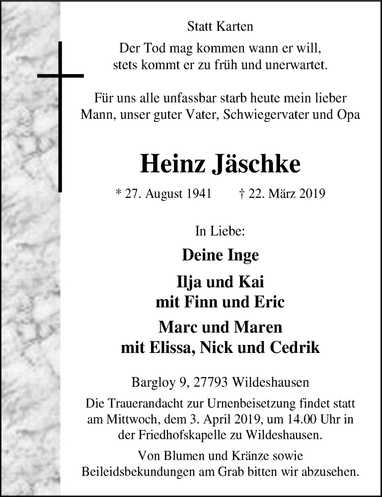 Hier finden Sie alle Traueranzeigen aus der Zeitung, die bisher für Heinz Jäschke erschienen sind. Weitere Traueranzeigen, die in der Zeitung erscheinen, werden hier ebenfalls aufgelistet