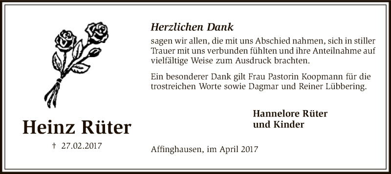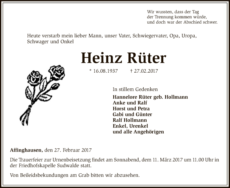 Hier finden Sie alle Traueranzeigen aus der Zeitung, die bisher für Heinz Rüter erschienen sind. Weitere Traueranzeigen, die in der Zeitung erscheinen, werden hier ebenfalls aufgelistet