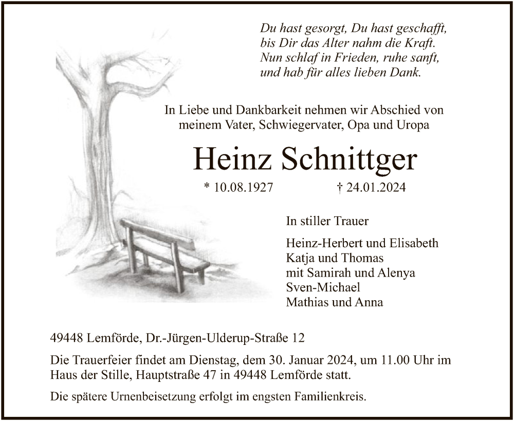Hier finden Sie alle Traueranzeigen aus der Zeitung, die bisher für Heinz Schnittger erschienen sind. Weitere Traueranzeigen, die in der Zeitung erscheinen, werden hier ebenfalls aufgelistet