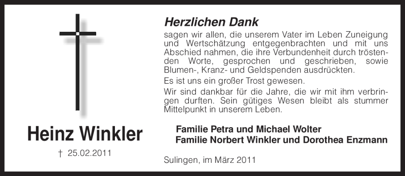 Hier finden Sie alle Traueranzeigen aus der Zeitung, die bisher für Heinz Winkler erschienen sind. Weitere Traueranzeigen, die in der Zeitung erscheinen, werden hier ebenfalls aufgelistet