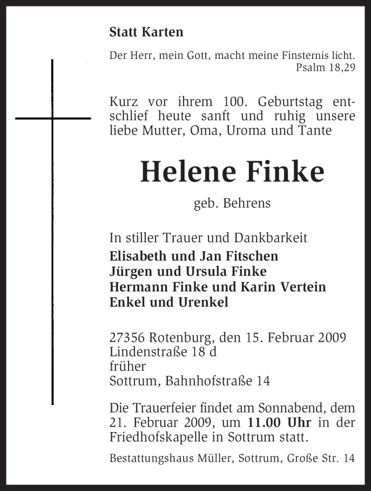 Hier finden Sie alle Traueranzeigen aus der Zeitung, die bisher für Helene Finke erschienen sind. Weitere Traueranzeigen, die in der Zeitung erscheinen, werden hier ebenfalls aufgelistet