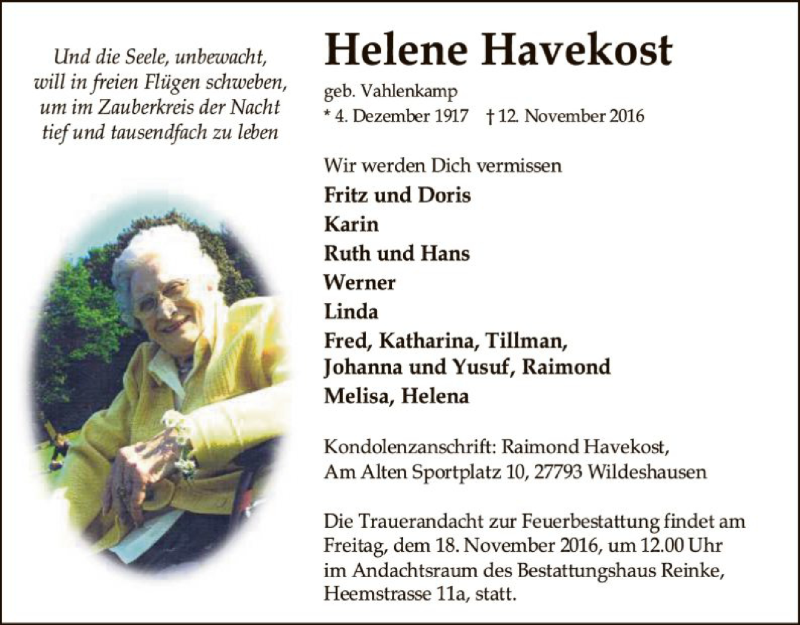 Hier finden Sie alle Traueranzeigen aus der Zeitung, die bisher für Helene Havekost erschienen sind. Weitere Traueranzeigen, die in der Zeitung erscheinen, werden hier ebenfalls aufgelistet