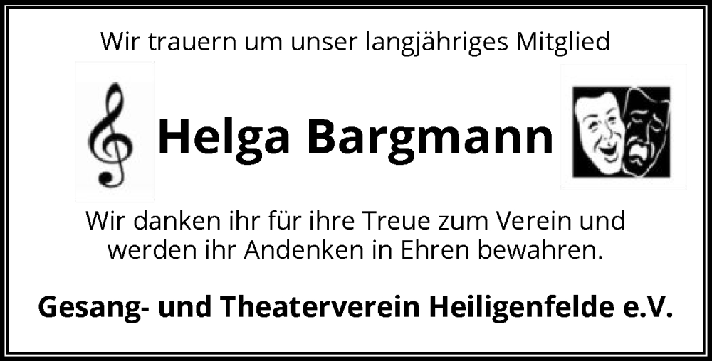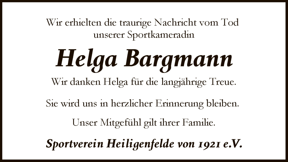 Hier finden Sie alle Traueranzeigen aus der Zeitung, die bisher für Helga Bargmann erschienen sind. Weitere Traueranzeigen, die in der Zeitung erscheinen, werden hier ebenfalls aufgelistet